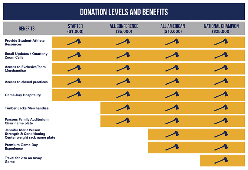 By joining annually, you’ll have the opportunity to play an integral role in our team’s success. As a member, you’ll receive exclusive privileges and benefits that are only reserved for members of OUR TEAM, while also providing vital resources that will help elevate Lumberjack Football to new heights.