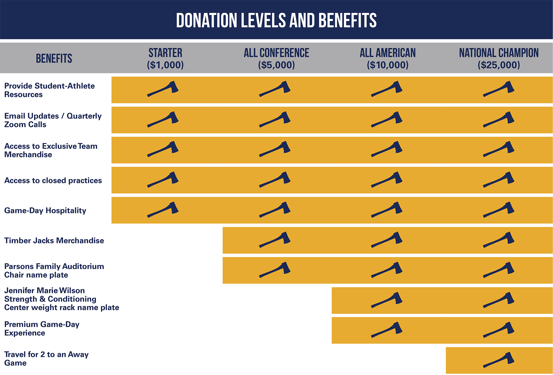 By joining annually, you’ll have the opportunity to play an integral role in our team’s success. As a member, you’ll receive exclusive privileges and benefits that are only reserved for members of OUR TEAM, while also providing vital resources that will help elevate Lumberjack Football to new heights.
